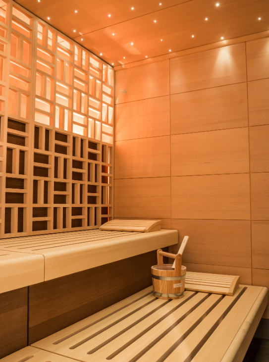 A steam room provides humid heat therapy, promoting relaxation, detoxification, improved circulation, and respiratory benefits.